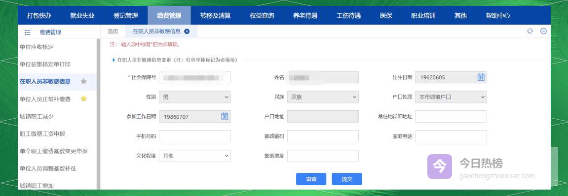 2.1 ▲ 入口位置进入网厅后,点击左侧菜单“缴费管理”→“在职人员非敏感信息变更”。
