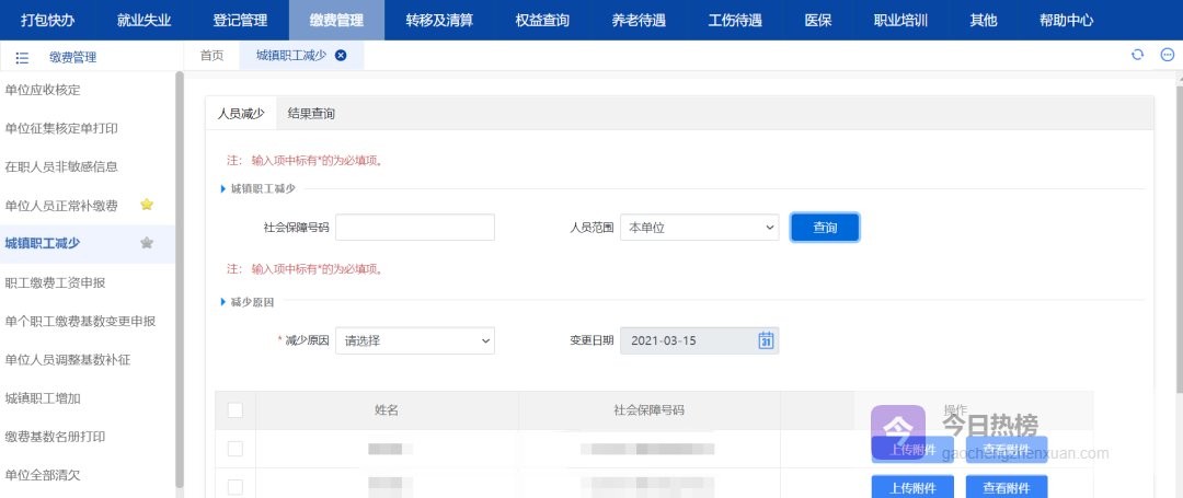选择减少原因,单选或多选相同原因人员,系统会弹窗提示需上传的附件(如死亡证明、出国定居签证页等),上传后再次核对,最后点击“提交”。