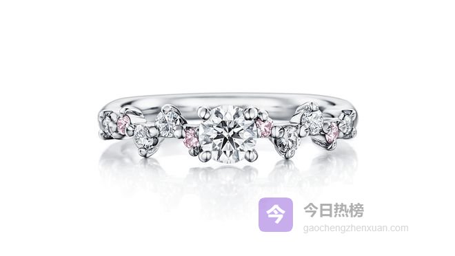 璀璨与色彩的交响:设计师巧妙地在戒臂上交错镶嵌了10颗粉色和白色的配钻。这种独特的色彩组合与不规则的排列方式,打破了传统婚戒的单调,展现出一种如同星光般随意洒落的自然美感,华丽而又不失高雅。