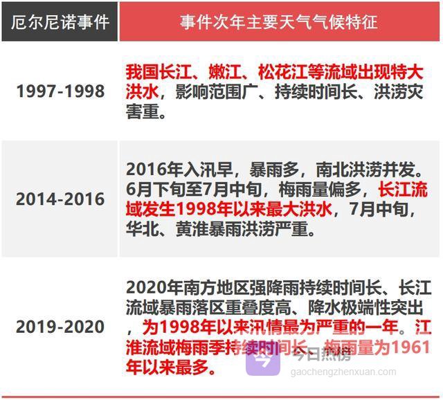 厄尔尼诺次年夏季,长江流域和江南地区容易出现洪涝(1998年和2016年长江流域特大暴雨洪涝);