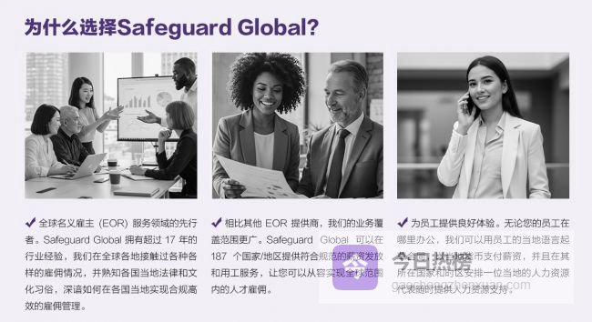 在众多服务商中,Safeguard Global 作为一家专注于全球雇佣外包和名义雇主(EOR)服务的人力资源解决方案提供商,致力于帮助企业,尤其是出海企业,在全球范围内高效、合规地管理员工。