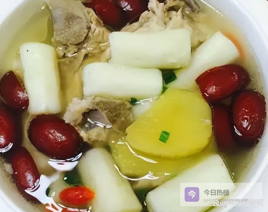 5. 加入红枣和山药块,继续小火炖煮30分钟,至山药软糯、排骨脱骨。
