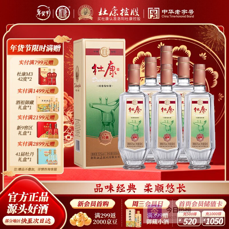 杜康【官方】经典浓香型白酒500ml*6瓶52度口粮酒纯粮食酒送礼 52度 500mL 6瓶 整箱(原箱发货)¥