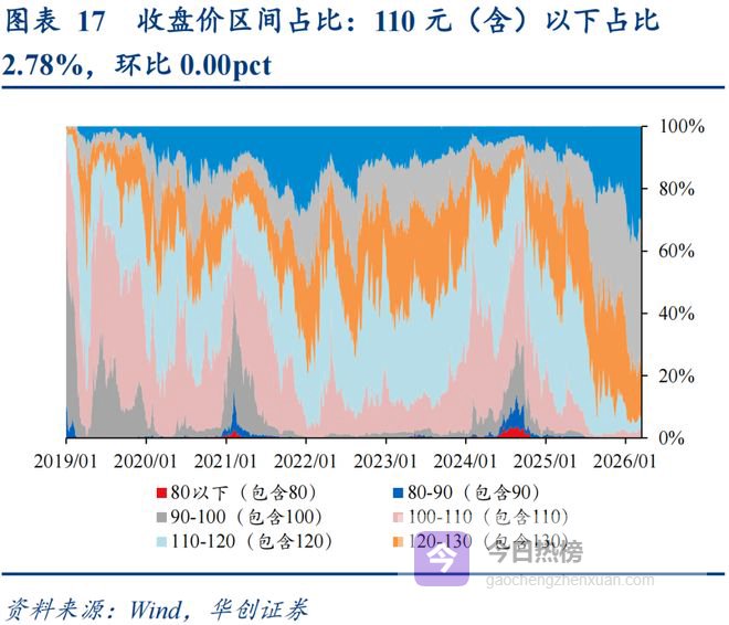 转债价格:转债中枢下降,高价券占比下降。转债整体收盘价加权平均值为139.00元,环比昨日下降0.33%。其中偏股型转债的收盘价为201.40元,环比上升0.92%;偏债型转债的收盘价为121.88元,环比下降0.07%;平衡型转债的收盘价为131.96元,环比下降0.15%。从转债收盘价分布情况看,130元以上高价券个数占比71.75%,较昨日环比下降1.66pct;占比变化最大的区间为110-120(包含120),占比4.43%,较昨日上升0.83pct;收盘价在100元以下的个券有0只。价格中位数为138.02元,环比昨日上升0.08%。