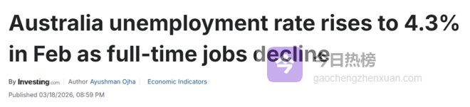 由于全职工作岗位减少,澳大利亚2月份失业率升至4.3%。