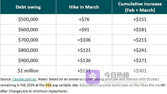 对一笔60万澳元、剩余25年还款期限的房贷来说,本次加息将使月供增加约91澳元,若计入2月的加息,总增幅将达到181澳元。