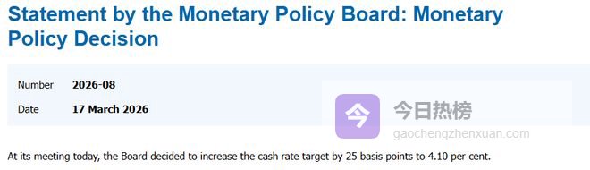 澳大利亚央行周二连续第二次上调基准政策利率,将其推至4.1%,这是自 2025 年 4 月以来的最高水平。