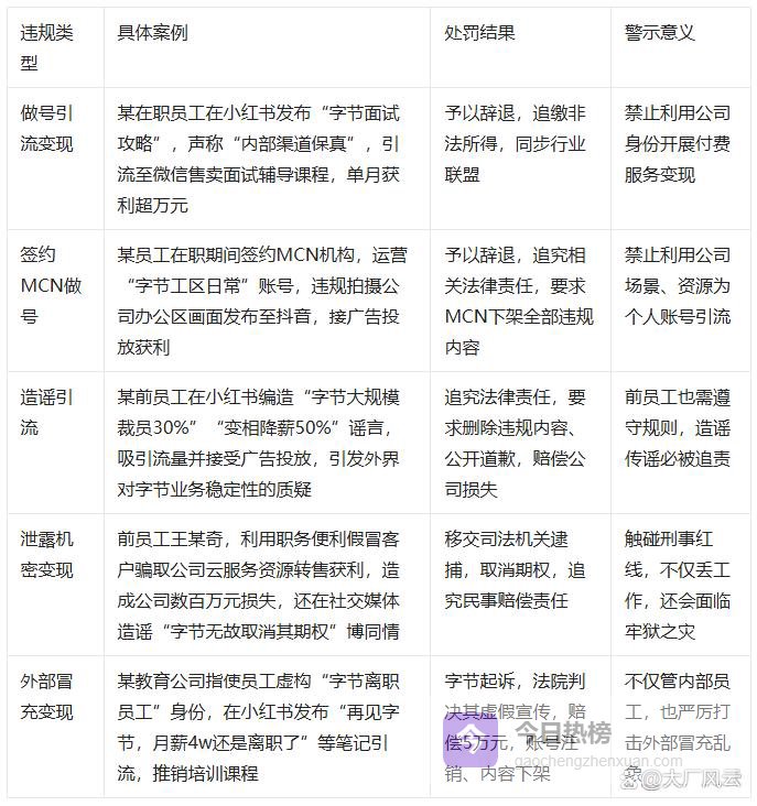 核心新规细则(必看):1. 全面禁止:在职员工不得以任何形式利用公司资源运营自媒体账号并牟利,包括但不限于引流带货、接广告、售卖面试辅导课程、签约MCN机构等;2. 强制申报:账号资料涉及字节、频繁发布公司相关内容,或月均变现超过500元的,需主动向公司申报,低于500元无需报备;3. 追溯前员工:即便离职,若存在违规泄露公司机密、冒充字节员工引流变现、造谣攻击公司等行为,公司仍将追究法律责任;4. 零容忍处罚:违规者将视情节轻重,给予纪律处分、辞退、取消期权等处罚,涉嫌违法的直接移交司法机关,并同步行业联盟拉黑。