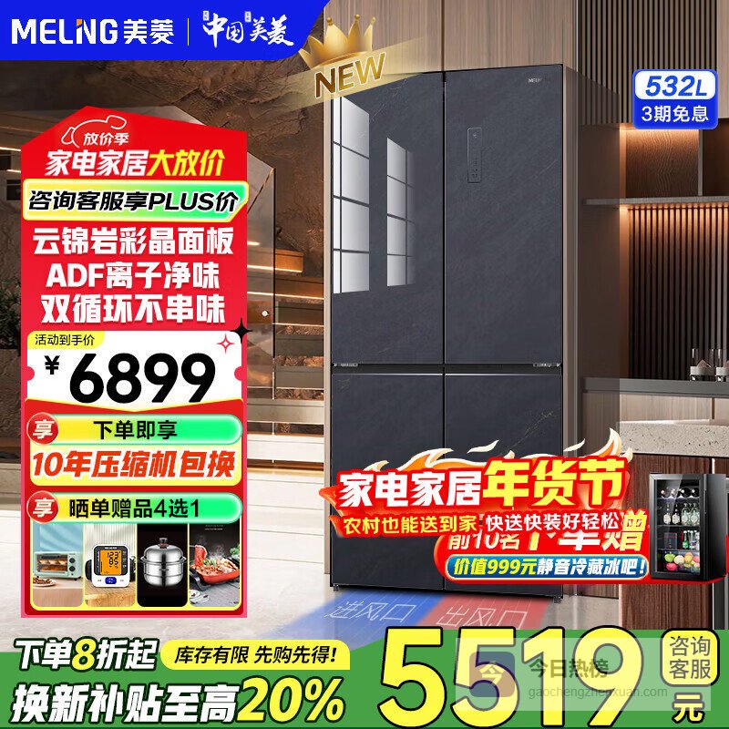 美菱(MeiLing)【魔法石系列】532升变频风冷无霜十字双开门四门冰箱一级能效精控分储净味保鲜 BCD-532WP9B云锦岩面板¥