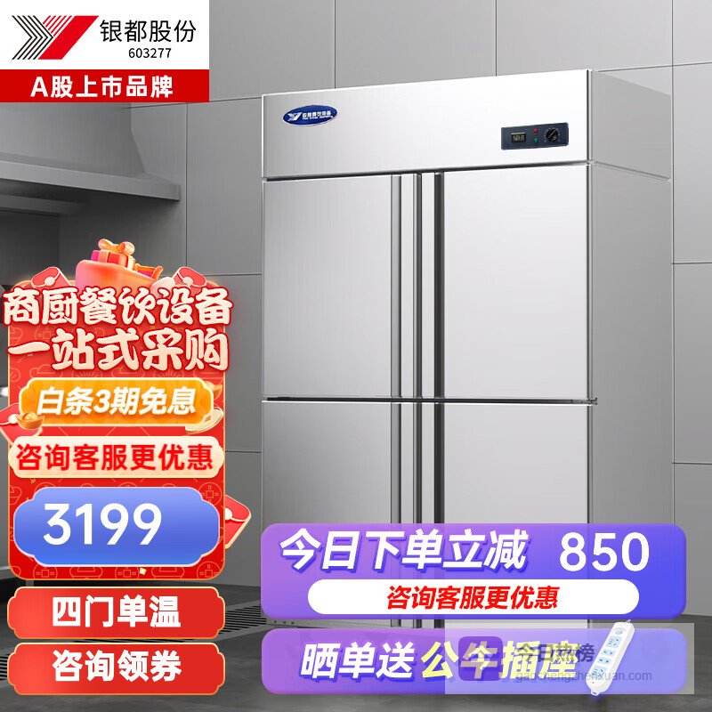 听名字就知道,银都主要专注于商用厨房设备。它的四门产品,准确来说应该叫四门陈列柜或四门冰箱,主要是为餐厅、便利店、食堂等商业场景设计的,特点是玻璃门展示效果好、容量大、制冷稳定,可以长时间连续工作。