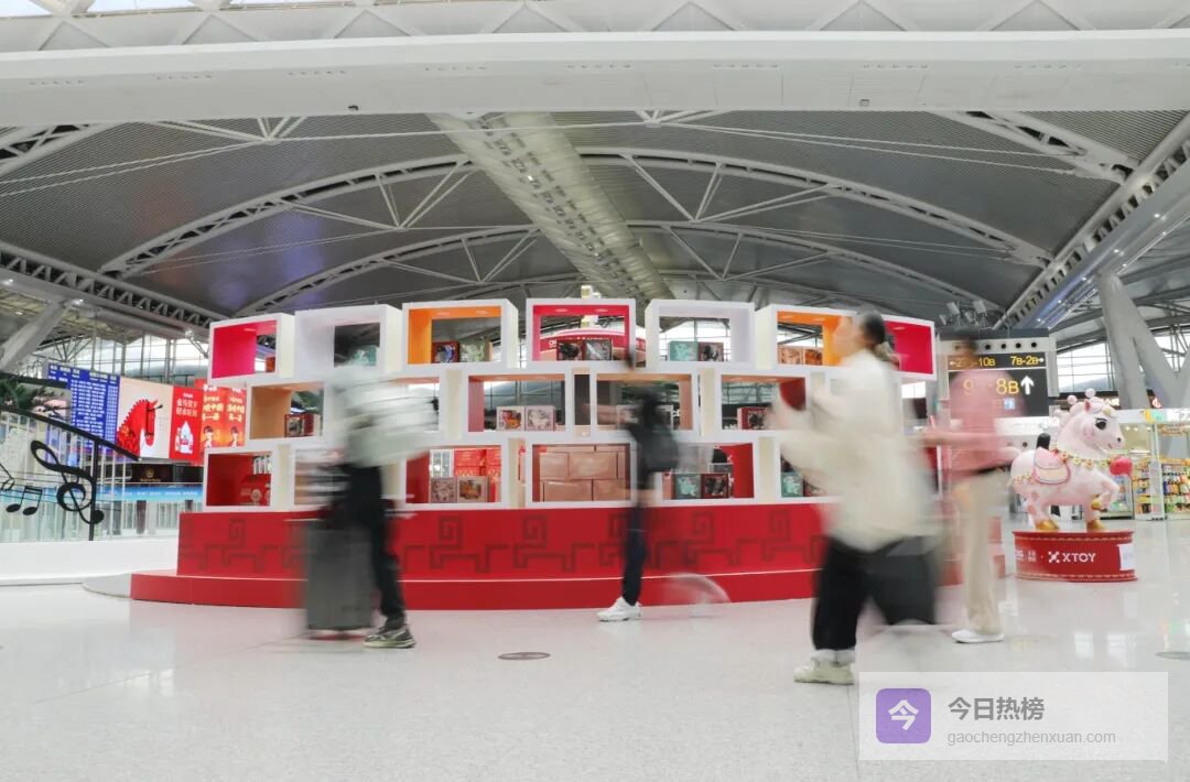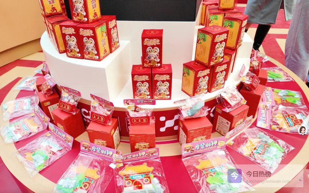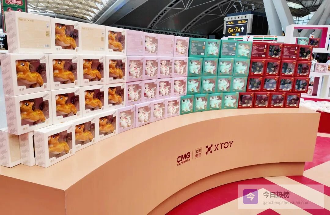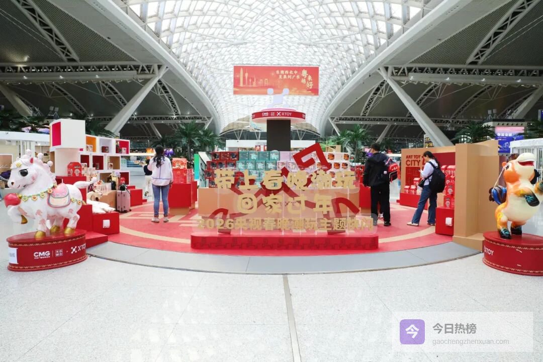 步入广州南站3楼中庭(近A14检票口),中国红与鎏金元素交织的展区格外醒目。红色亚克力立方体展柜以积木式拼叠呈现,传统年味与现代潮玩美学碰撞交融,喜庆时尚的新春氛围扑面而来。