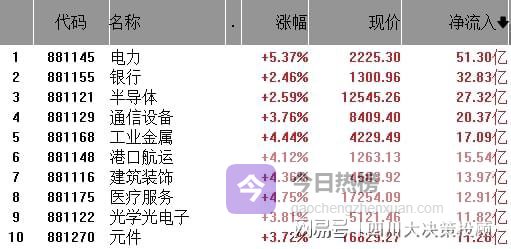从行业板块资金净流入来看,电力、银行、半导体净流入排名前三,通信设备、港口航运、工业金属等紧随其后。