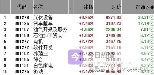 从行业板块资金净流出来看,光伏设备、汽车整车、油气开采及服务净流出排名前三,石油加工贸易、软件开发、电机等紧随其后。