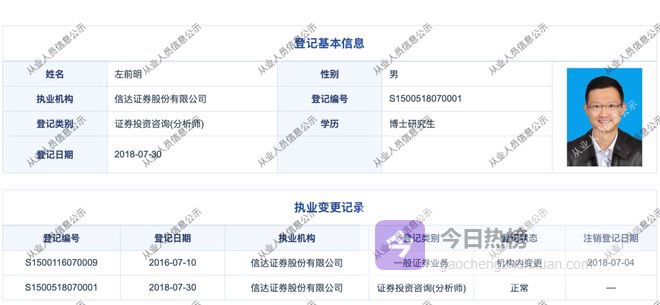 中证协官网资料显示,左前明的执业登记机构登记为信达证券,登记类别为一般证券业务。2018年7月30日,左前明在信达证券的登记类别变更为证券投资咨询(分析师)。截至发稿,左前明在信达证券的登记状态仍显示正常。