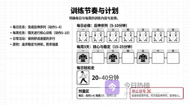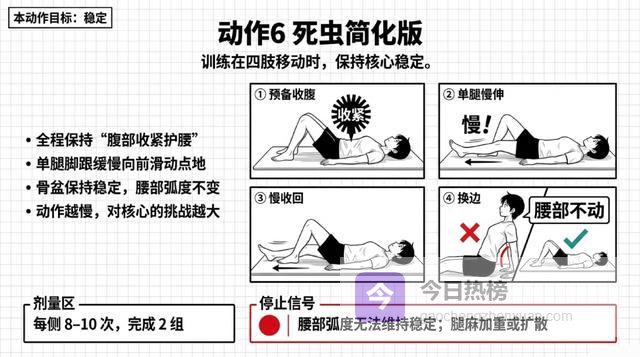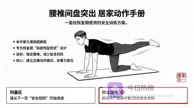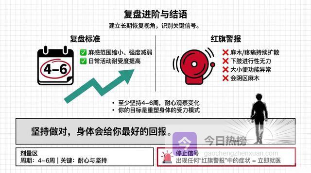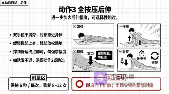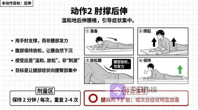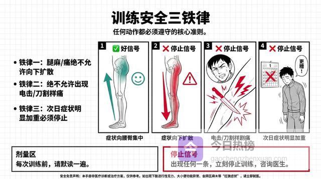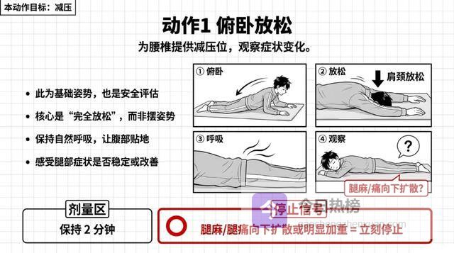 铁律:任何动作只允许"腰更酸一点",不允许"腿麻更重、麻的范围变大、或者疼痛往腿上走"。如果出现后者,立刻停止!