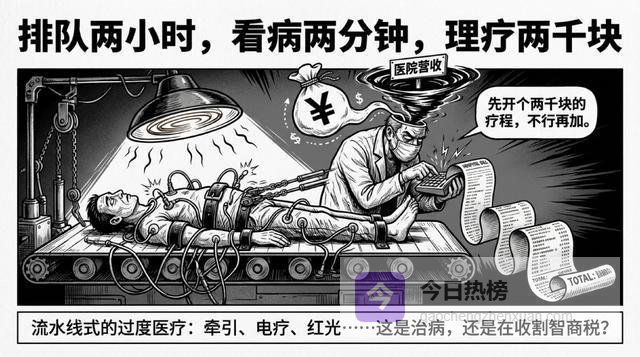 然后呢?医生开始念经了:"先做个疗程理疗吧——牵引、电疗、超声波、红光、针灸,全套来一遍。"