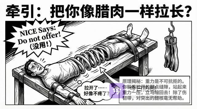 为什么?因为牵引的效果是暂时的。你被拉的时候,椎间隙确实会稍微大一点,但你一站起来,重力一压,马上又回去了。而且长期牵引还可能损伤韧带。