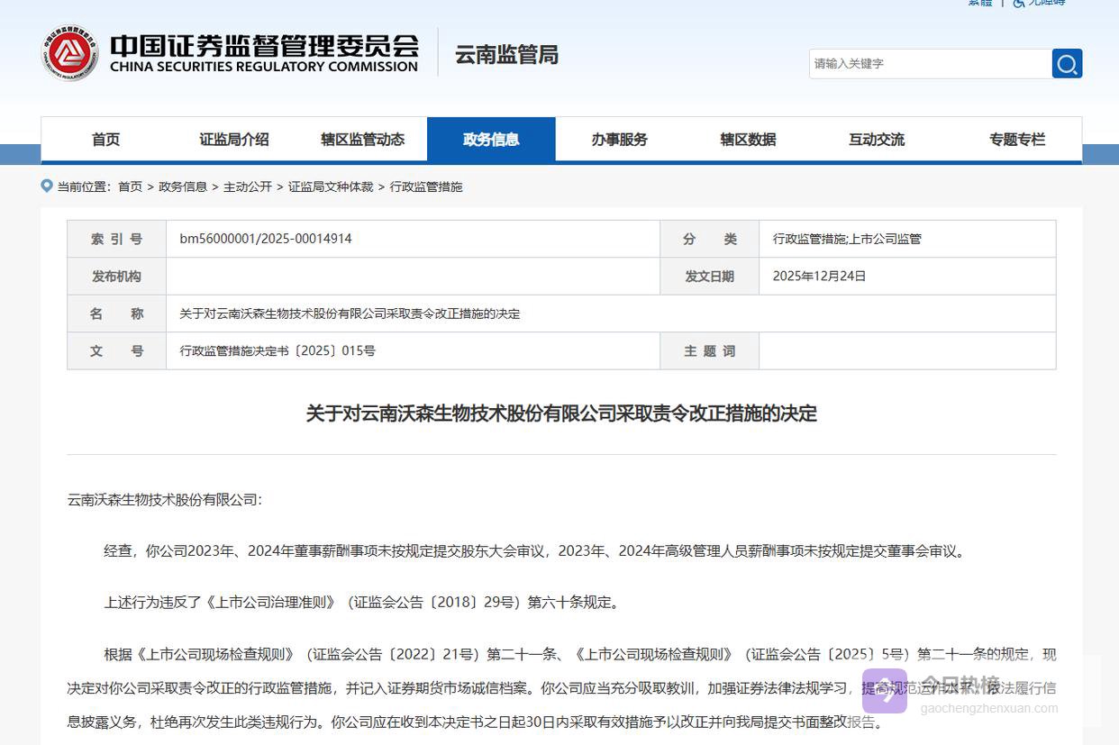 公告显示,沃森生物2023年、2024年董事薪酬事项未按规定提交股东大会审议,2023年、2024年高级管理人员薪酬事项未按规定提交董事会审议,因此对公司采取责令改正的行政监管措施,并记入证券期货市场诚信档案。