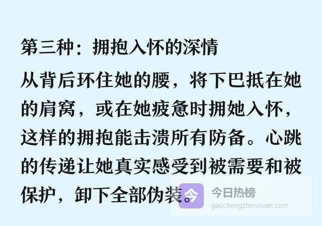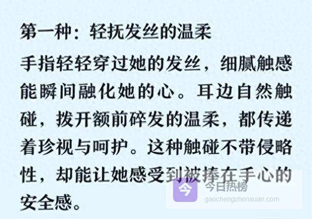 得找她不便还手的缝隙:她趴在餐桌算账单,头发垂脸,你走过去倒水,袖口顺手把她的发丝撩到耳后,动作快到像“顺手清理障碍”。她可能头都不抬,但那一瞬额角皮肤掠过的凉意,替你把“我在意你”写进她的体感。