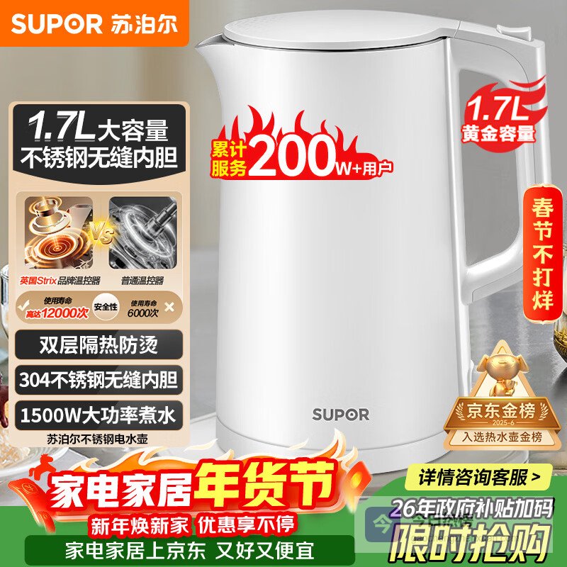苏泊尔(SUPOR)电水壶 双层防烫烧水壶热水壶1.7L 全钢无缝内胆304不锈钢电热水壶大容量 SW-17J418¥