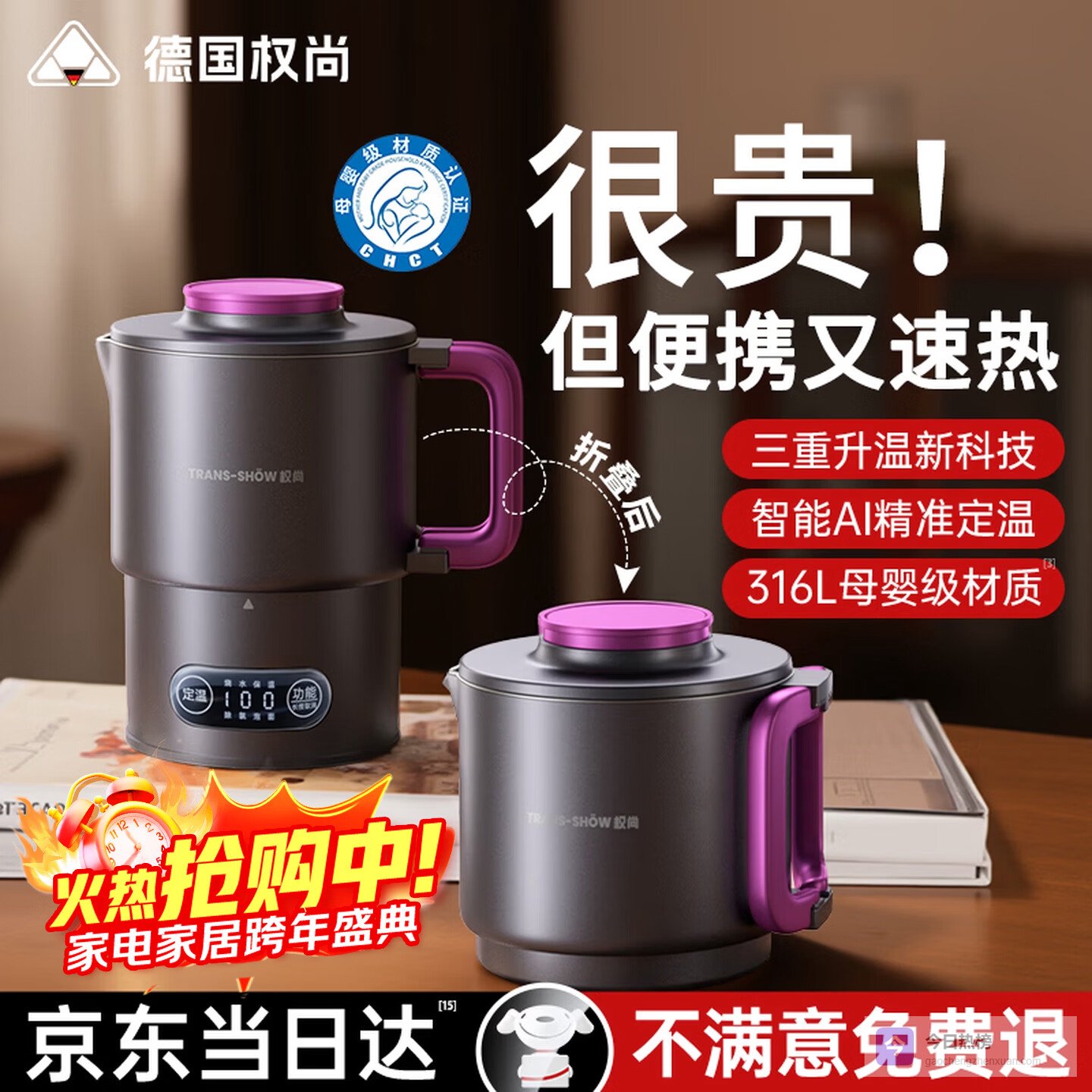 权尚【德国品牌丨极速热】折叠烧水壶户外迷你电热烧水壶旅行便携式热水壶恒温家用316L不锈钢出差定温 0.7L 【2026年新款原装正品】 【旅行出差优选】便携式可折叠烧水壶¥