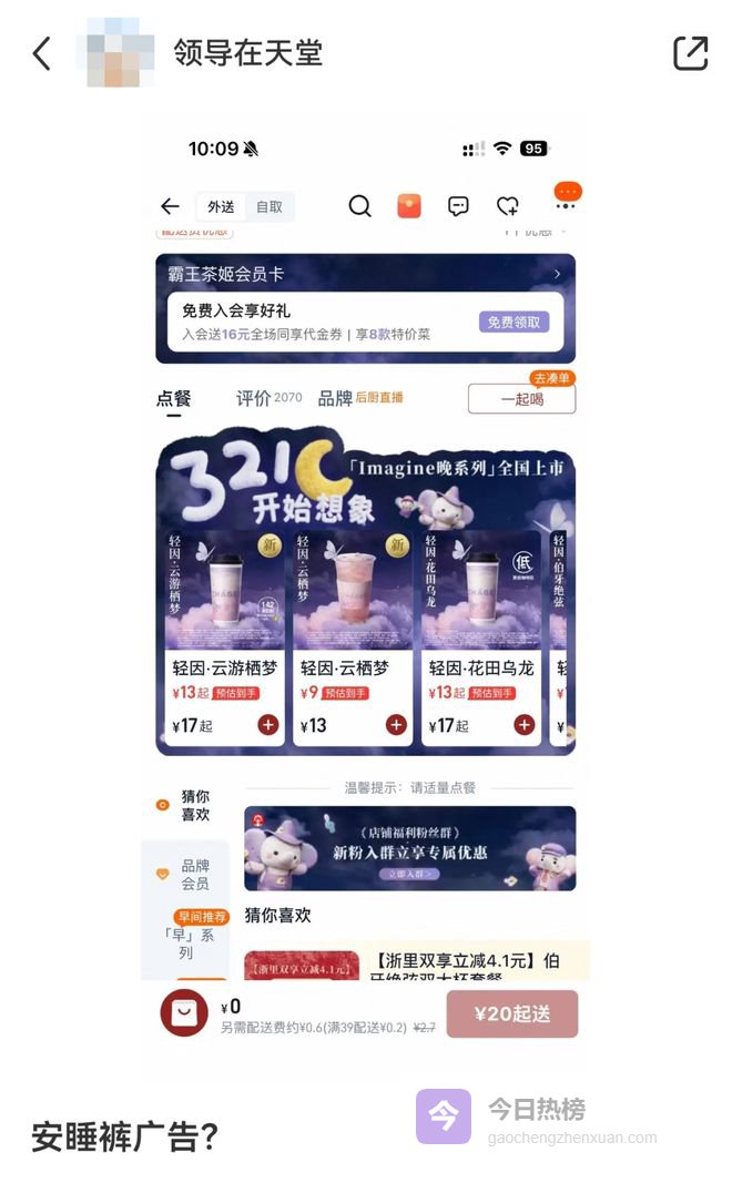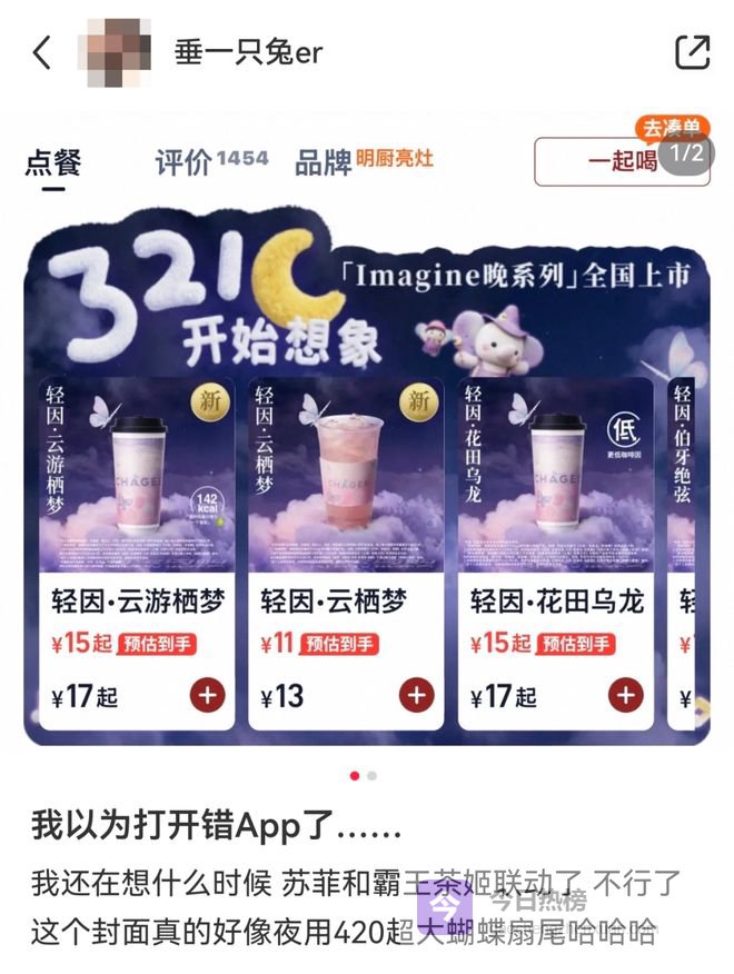 而霸王茶姬新推出的「Imagine晚系列」,虽说宣传图、点单界面等被质疑和女性护理产品的风格雷同。