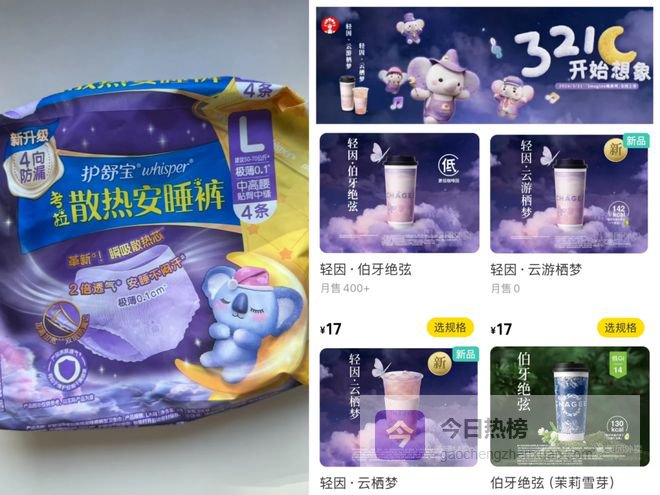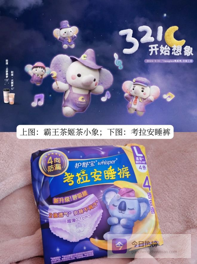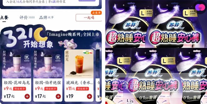 再加上霸王茶姬「Imagine晚系列」的视觉设计主打的是“夜晚、遐想、放松”场景;这与女性护理产品安睡裤强调的“夜晚、安睡、放松”的主题也高度贴合。