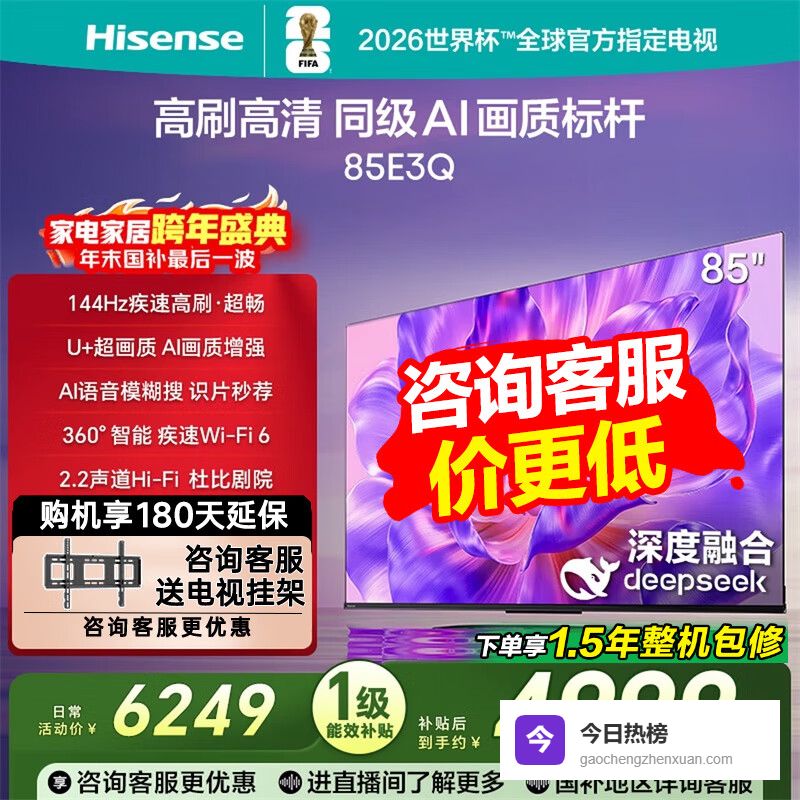2、海信85E3Q这款平板电视在视听体验上真是下了功夫!144Hz 的高刷屏,看电影、玩游戏都超流畅,告别拖影和卡顿。U+ 超画质引擎和臻彩四维还原,色彩和细节都表现得淋漓尽致,再加上 4K HDR 超分技术,低分辨率片源也能变得更清晰。它还配备了 MEMC 运动还原和防抖技术,看体育赛事、赛车啥的,画面稳定又清晰,再也不用担心眼花了。