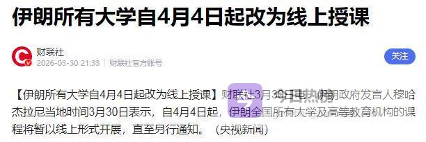 3月30日,伊朗政府发言人穆哈杰拉尼宣布,自4月4日起,全国所有大学和高等教育机构课程暂以线上形式开展,直至另行通知。