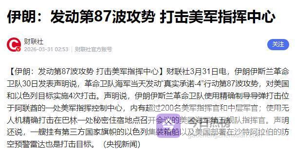 3月30日,伊朗伊斯兰革命卫队发动“真实承诺-4”行动第87波攻势,不再是炸机场、打装备的常规报复,而是精准锁定美军中东指挥体系核心,直接“打人”。