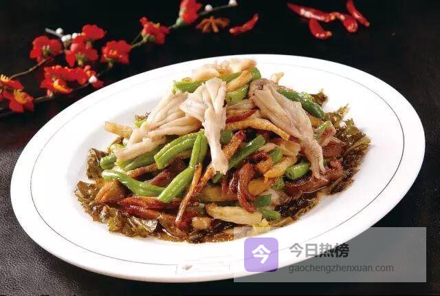 扁豆段六成油温炸至碧绿挺括,先定型再吸汁;
