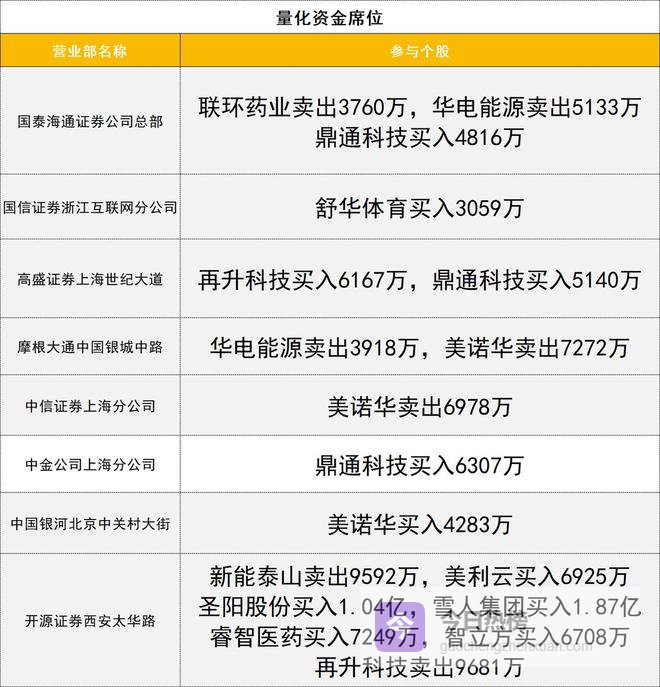 龙虎榜方面,可控核聚变概念股雪人集团尾盘涨停,获三家一线游资(国泰海通证券成都北一环路、国泰海通证券南京太平南路、国泰海通证券上海江苏路)合计买入1.83亿。圣阳股份今日冲板回落,一家量化(开源证券西安太华路)买入1.04亿,一家游资(国泰海通证券上海海阳西路)买入0.55亿,同时遭两家游资(国泰海通证券武汉紫阳东路、国泰海通证券成都北一环路)合计卖出2.59亿。