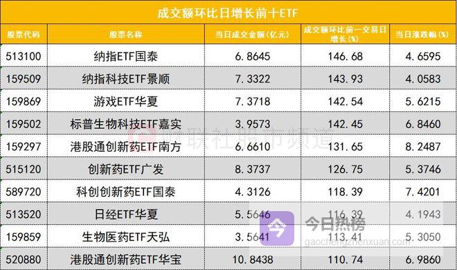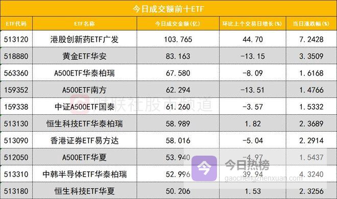 从成交额前十的ETF来看,港股创新药ETF广发(513120)成交额位居首位,黄金ETF华安(518880)成交额位居次席。