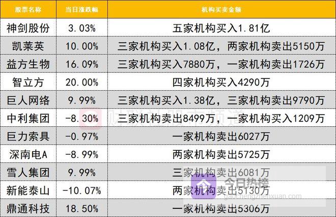 今日龙虎榜机构活跃度较高,商业航天人气股神剑股份获五家机构买入1.81亿。医药板块强势爆发,其中凯莱英获三家机构买入1.08亿,同时遭两家机构卖出5150万。