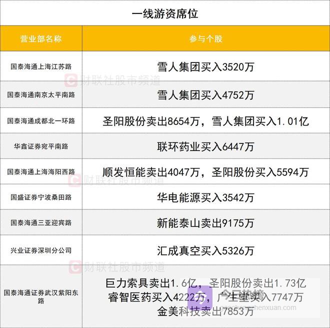 一线游资活跃度较高,可控核聚变概念股雪人集团尾盘涨停,获三家一线游资(国泰海通证券成都北一环路、国泰海通证券南京太平南路、国泰海通证券上海江苏路)合计买入1.83亿。圣阳股份获一家游资(国泰海通证券上海海阳西路)买入0.55亿,而同时遭两家游资(国泰海通证券武汉紫阳东路、国泰海通证券成都北一环路)合计卖出2.59亿。