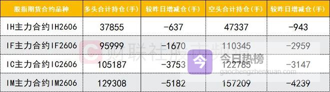 四大期指主力合约中,IH、IF、IC、IM合约多空双方均减仓,IF合约空头减仓数量较多,IM合约多头减仓数量较多。
