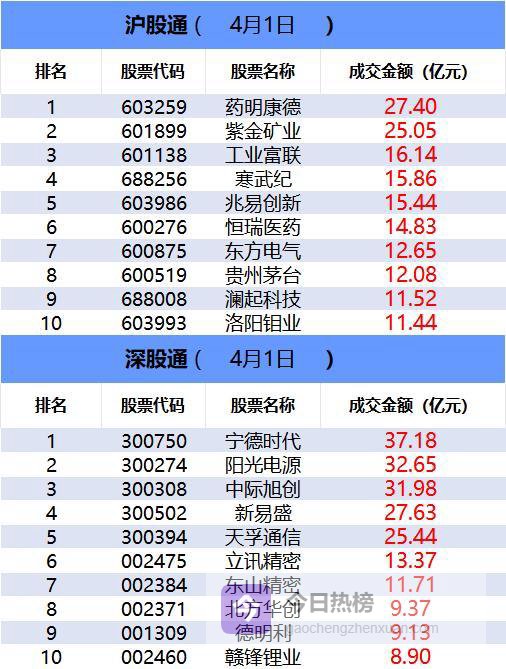 从沪股通前十大成交个股来看,药明康德位居首位;紫金矿业和工业富联分居二、三位。