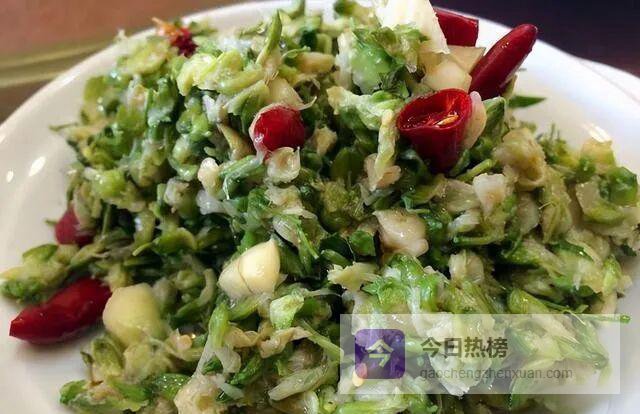 槐花炒蛋:沸水焯后挤干水分,打入鸡蛋同炒,蛋香与花香交汇,入口即化。