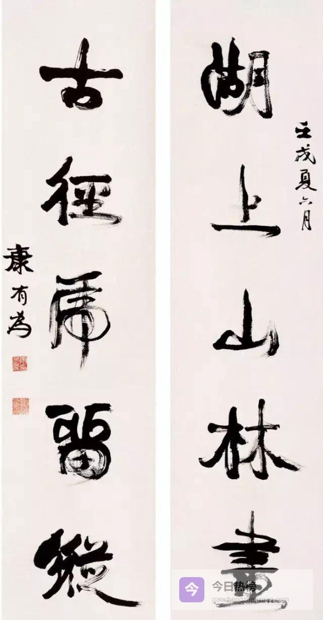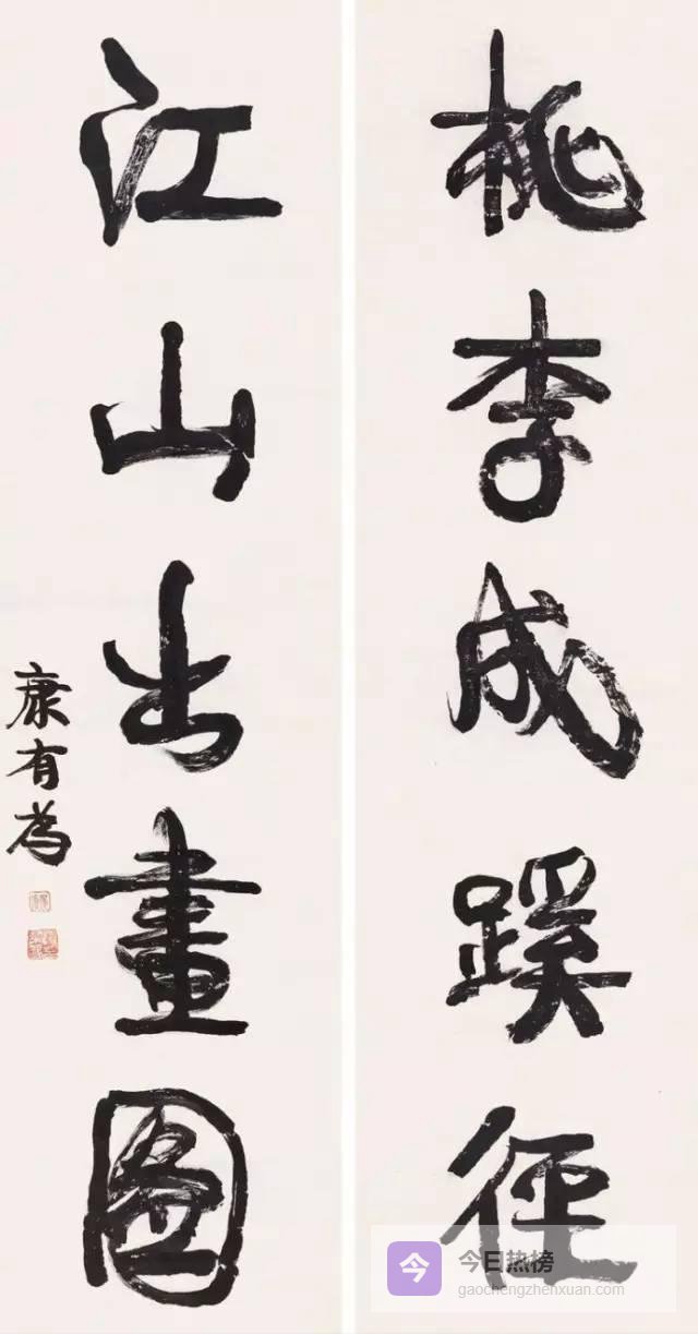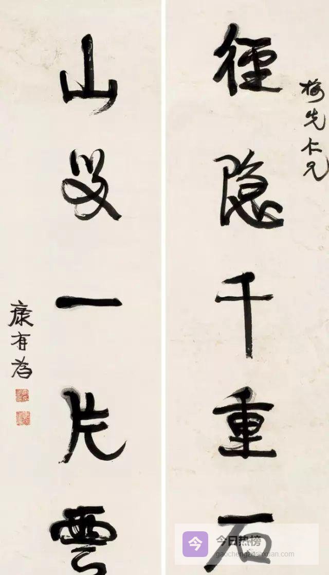 康有为书法结字上紧下松,纵横奇宕,气势开张,干脆遒劲,具有浓郁的北碑笔意,可谓熔铸古今,自成气象欣赏康有为书法,其变化多姿、不拘一格,让人眼花缭乱。书体在枯润、疏密、显晦、清浊的变动与游移中,又饱含着紧张、膨胀与挣扎。
