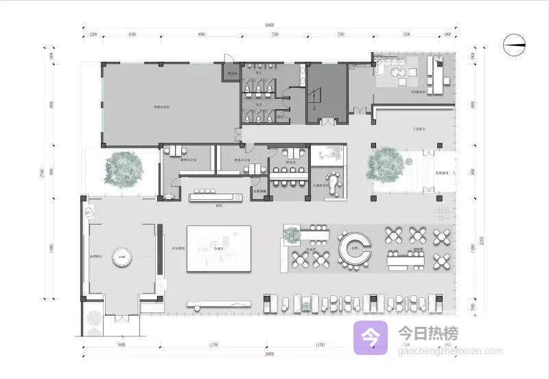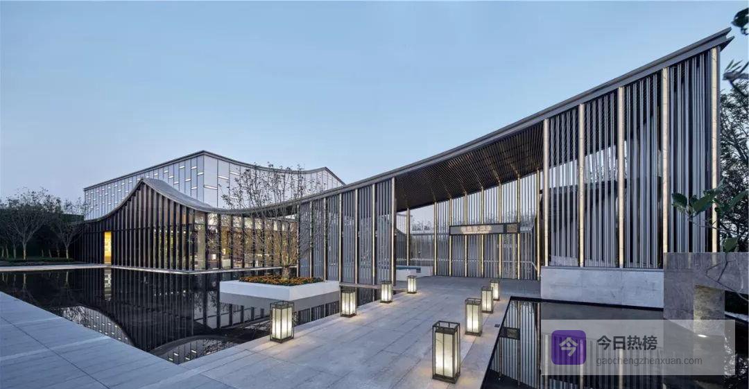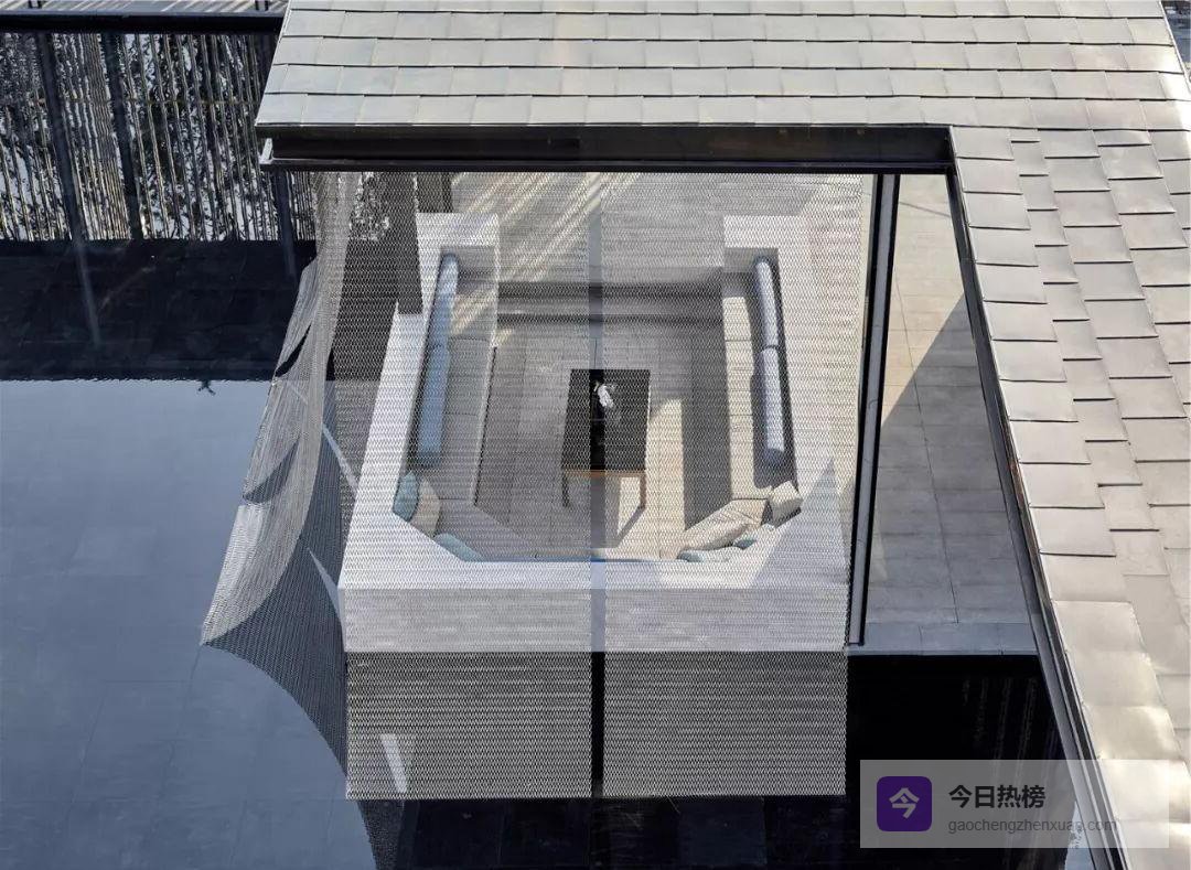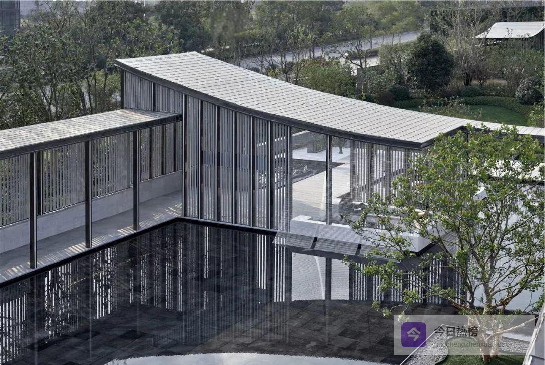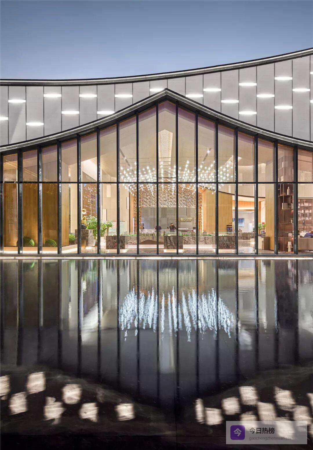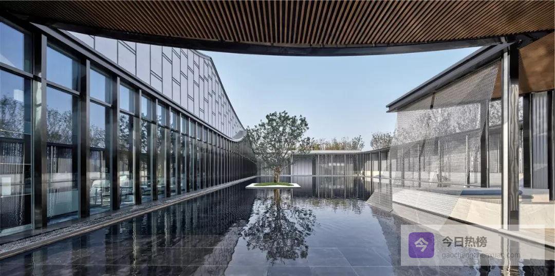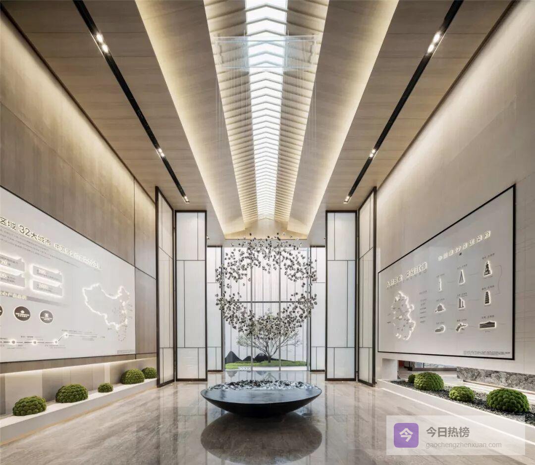 山墙曲线走到室内,化身“大幕”。南北轴线被它轻轻一拉,展厅与水院便有了仪式感;洽谈区借水院的倒影获得半私密缓冲。7米挑高玻璃幕墙采用900 mm超密龙骨,既保证通透又留出“老房子看院子”的熟悉视角——一眼望去,是徽派天井的现代翻版。