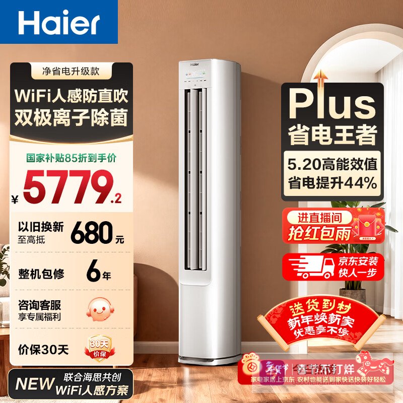海尔空调净省电Plus 3匹强劲冷暖新一级能效节能变频家用立式柜机独立除湿双排铜管升级大风口离子除菌 3匹 一级能效净省电神机+离子除菌+省电大魔王¥