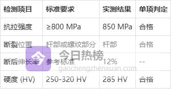 五、报告解读与后续应用衔接 拿到检测报告后,如何解读数据并与实际应用挂钩是另一个关键。报告上的“抗拉强度”是一个具体数值,但必须对照产品标准要求的极限值进行判定。例如,8.8级螺栓的抗拉强度要求不低于800MPa,实测值为850MPa是合格的。但若螺钉在使用中发生早期失效,不能只看抗拉强度单项,还需结合硬度、脱碳层、金相组织等其它检测项目进行综合分析。检测的最终目的是为了控制质量和解决问题,而非仅仅获取一纸证书,因此选择能提供技术咨询和结果分析的检测机构更为重要。