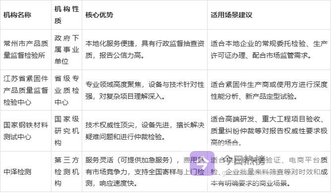 最后是常州螺钉抗拉强度去哪里检测标准报告的检测机构名单,并用表格对比,给出了常州螺钉抗拉强度去哪里检测机构的选择建议,分为政府背景机构、综合型第三方行业机构。
