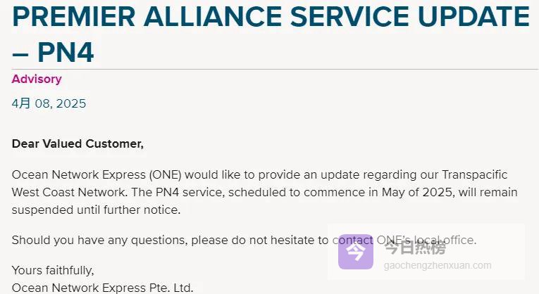 ONE公司原定5月复航的航线被无限期搁置