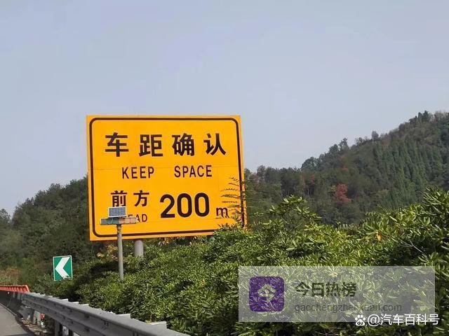 路边会先有一个黄色的大牌子,上面写着车距确认,前方200米。然后就会出现一组绿色的牌子,上面、写着0m、50m、100m、200m。在高速上行驶时间久了,眼睛会对距离产生错觉,看距离不太准了。比如明明是100米的距离,你却看着是200米。通过车距确认这几个标牌,能让眼睛和大脑重新感知正确的距离,保持安全跟车距离。