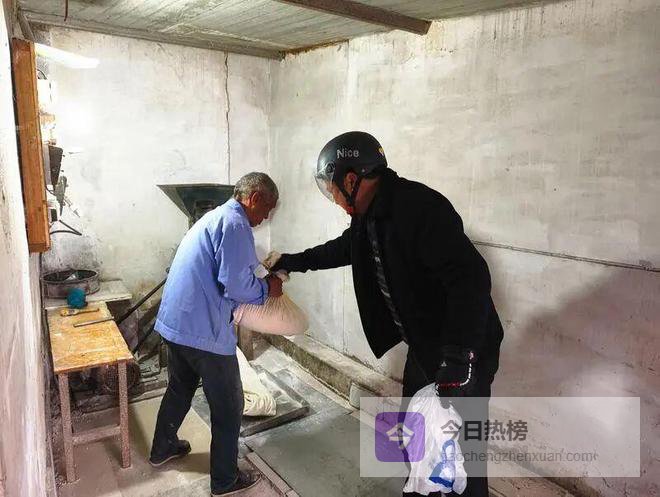 走进厂里,朱师傅正忙着接待前来轧粉的村民。附近村民丁大叔拎着一袋米走了进来,称重、交米、排队,一切都显得熟门熟路。