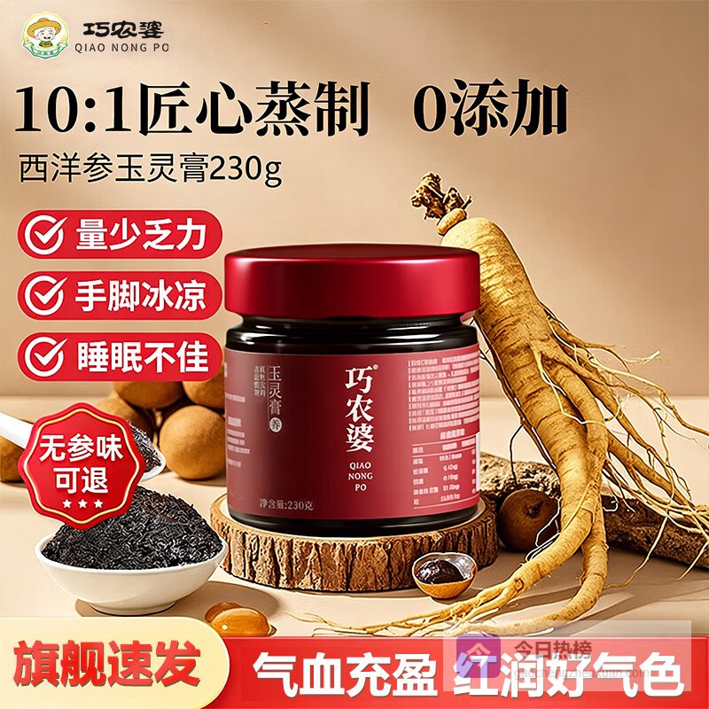核心优势:✅ 230g×3瓶套装 日均成本不足3元 别被“农婆”二字误导——这款的西洋参切片肉眼可见,每瓶含参量约15%,相当于每天摄入2g西洋参。采用柴火蒸制72小时,膏体呈现标准玛瑙红,甜度控制得恰到好处(无齁喉感)。