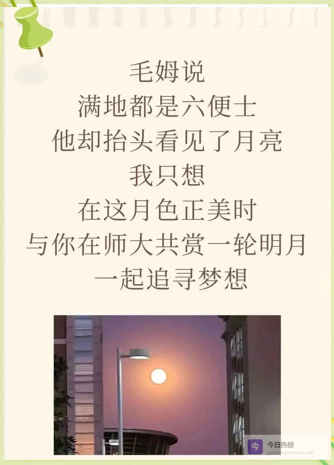 有人每天多走十分钟,去“追”那轮挂在文渊楼屋顶的月亮;也有人蹲在垃圾桶旁捡便士——用废旧纸箱做笔筒、用塑料瓶做花盆。看似矛盾的两种姿态,在师大被和解:理想可以远大,日子必须踏实;浪漫可以张扬,烟火必须日常。