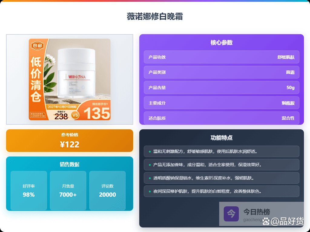 八、薇诺娜这款薇诺娜晚霜,一摸就是“补给站”般的存在,深层修护夜间皮肤,帮你悄悄变白。用了21天,肌肤亮度明明白白提升不少,暗沉和斑点都被“撵跑”,感觉像睡了个“变白梦”。它还帮肌肤筑了一道坚固的“防护墙”,夜里修复白天的“小伤痕”。