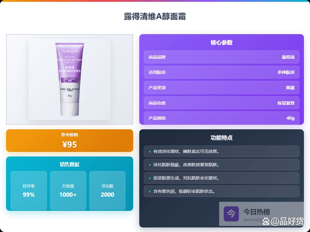 七、露得清这款露得清维A醇面霜,主要的兵器就是高浓度的真A醇,试了下,干纹和细纹都能悄悄变淡,就像肌肤的修复小帮手。它还能帮你改善肌肤的纹理,让脸看起来更细腻光滑,还不需要什么复杂的步骤,用完一晚第二天就能感觉到肌肤更嫩了点。肌肤不再暗沉,透亮感满满,真的是夜间护肤的“秘密武器”。